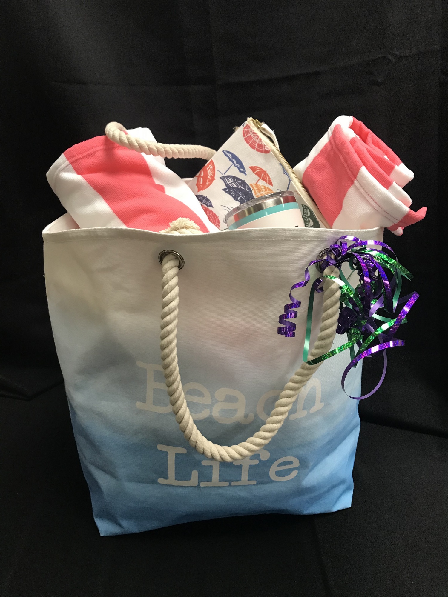 Soak up the sun and relax at the beach with this canvas beach bag, two portable beach chairs, two beach towels, striped beach umbrella, and a 24 oz. aqua Corkcicle tumbler.