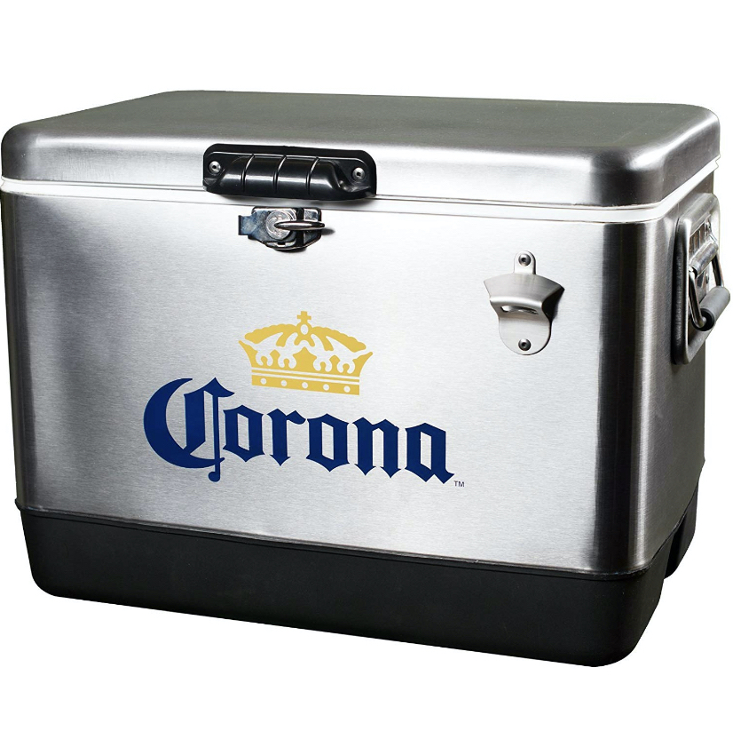 Stay cool at your next outdoor get-together with this stainless steel Coleman 54-quart Corona cooler and two six-packs of Corona Mexican beer.