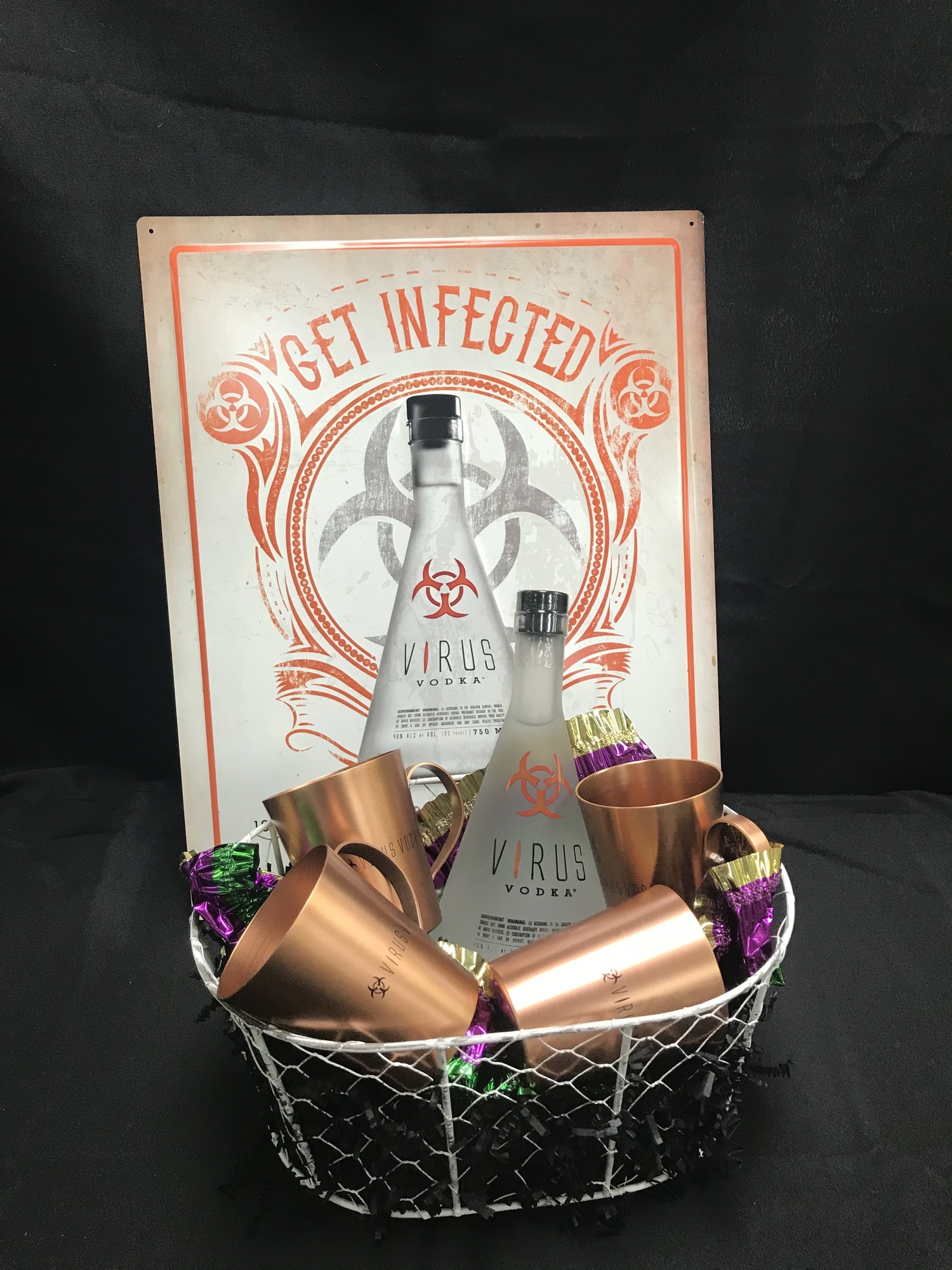 Spread the virus! Get infected with Virus Vodka, (4) Virus Vodka mule mugs, and a metal "get infected" sign!