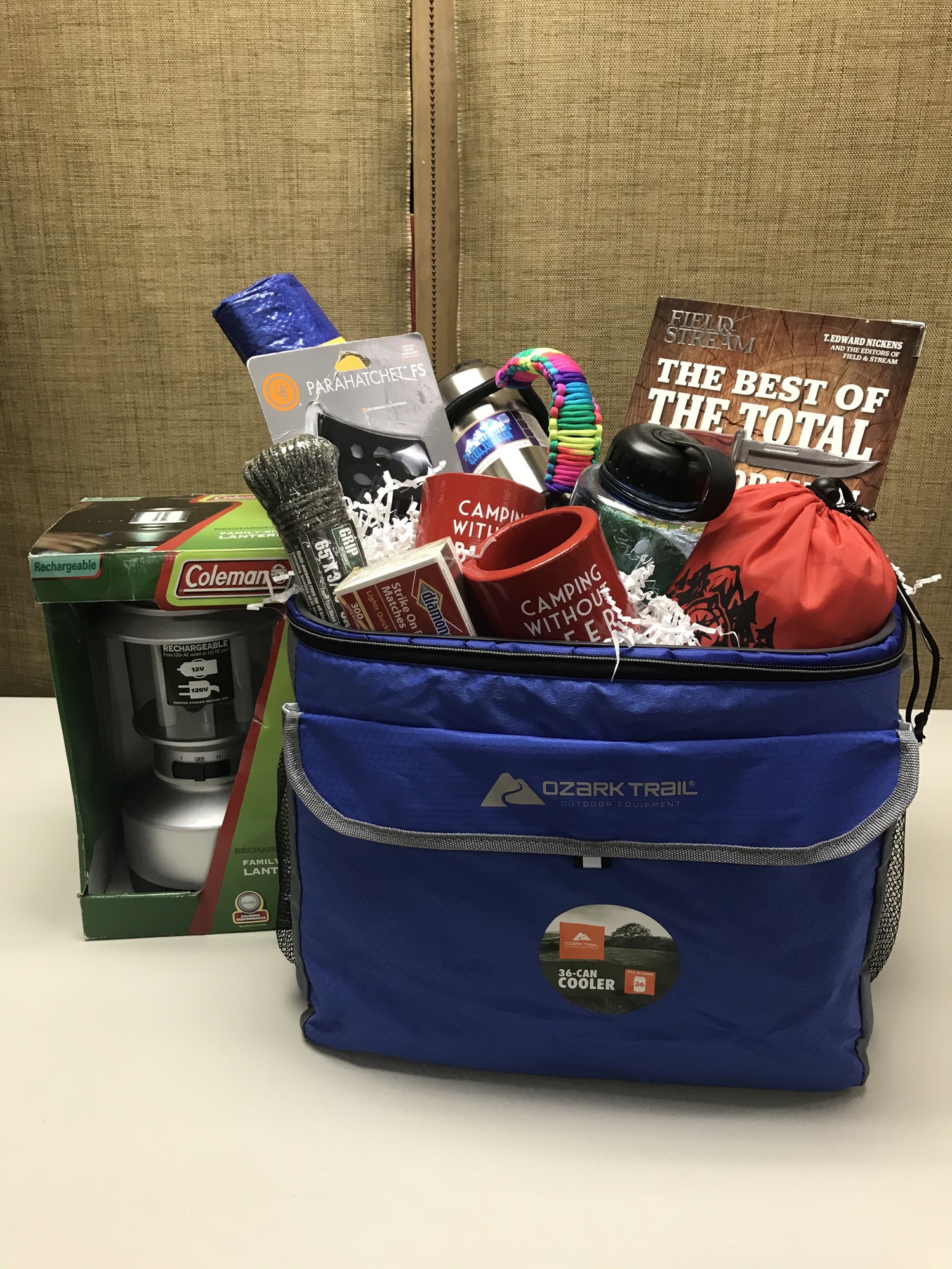 Get ready to rough it with "The Best of the Total Outdoorsman" book, an Ozark Trail 36-can soft-sided cooler, a lounge hammock, a parahatchet, an outdoor tarp, a camo rope, two camping koozies, a Survival water bottle, a 20oz. stainless steel tumbler with a multi-colored handle, matches, and a Coleman rechargeable lantern.