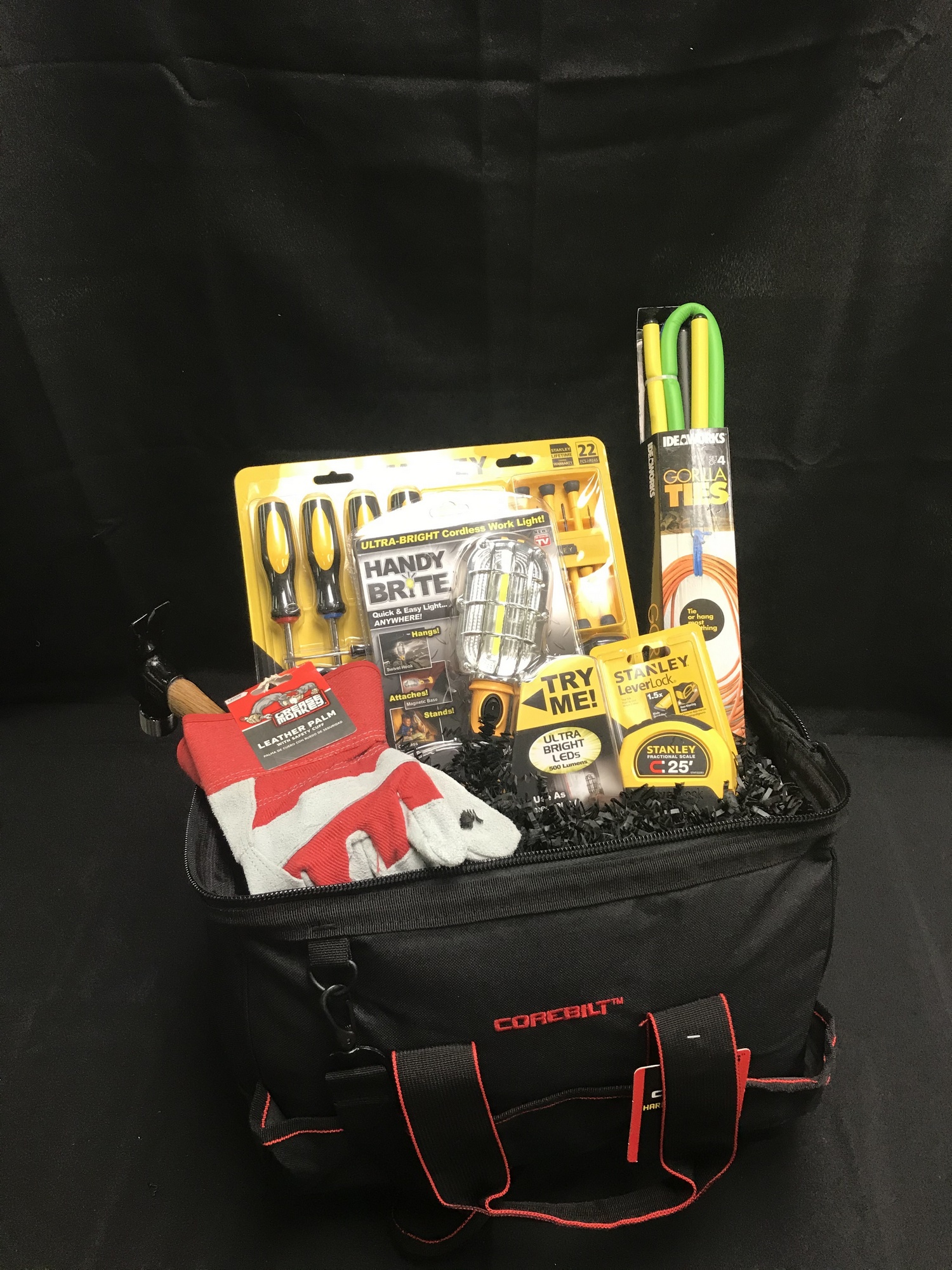 Any man or woman will be extra handy with this tool set containing a 16" hard tool bag, a Stanley hammer, a Stanley lever lock tape measure, a Stanley 22-piece screwdriver set, a handy light, Gorilla ties, and leather palm gloves.