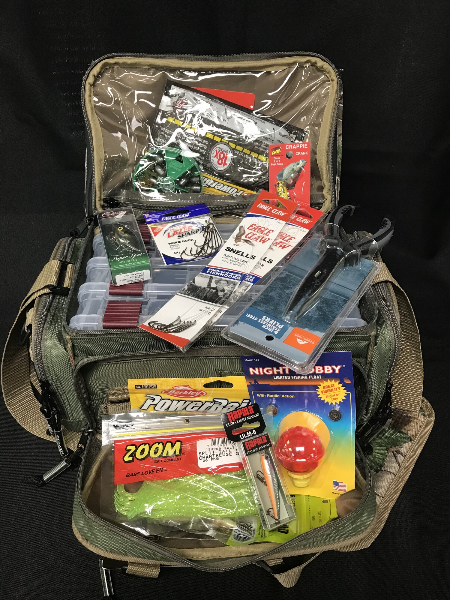 Cast away with this Plano soft side tackle bag equipped with lures, hooks, bait, bobbers, stringer, and much more!