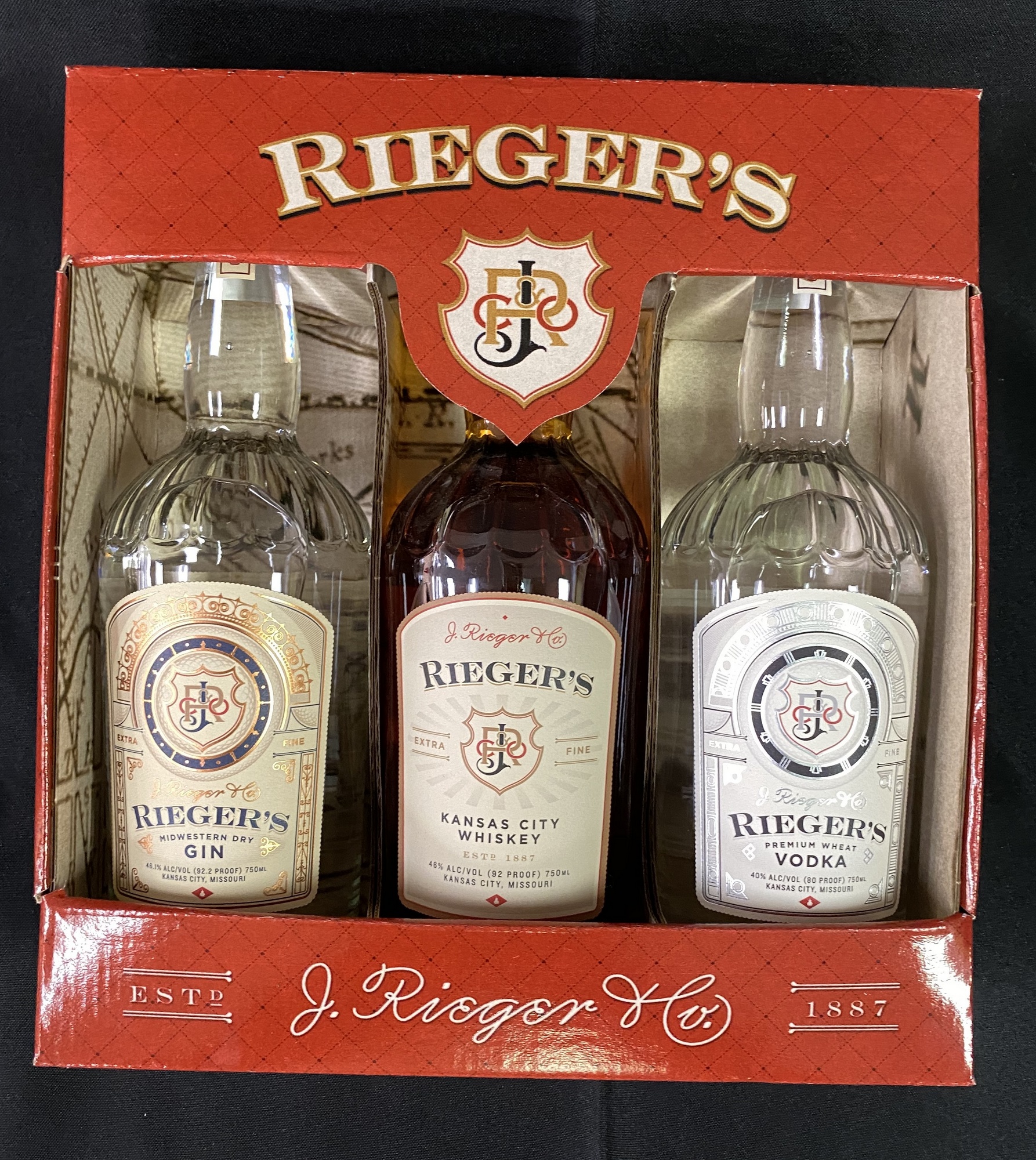 This boxed set from J. Rieger & Co. includes (3) 750mL bottles of some of Kansas City's favorite spirits! The box includes one bottle of Rieger's Gin, one bottle of Rieger's Vodka, and one bottle of Rieger's Kansas City Whiskey.