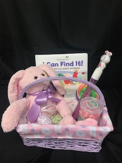 Little ones will be overjoyed when they see this fabric-lined lavender basket containing a pink stuffed bunny, beaded Easter ornaments, a message decor box, lollipops, bubbles, and the book, "I Can Find It!".