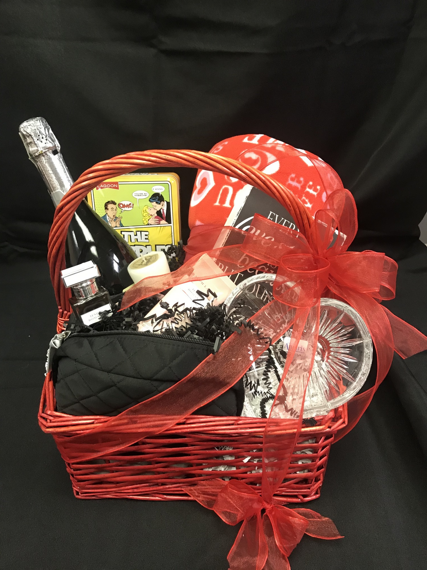 This HEART-warming Valentine's Day basket is LOVEly for any couple! This basket includes an XO blanket, The Couples Quiz! game, a Ralph Lauren cosmetic bag with Tender Romance eau de parfum spray and sensuous body moisturizer, a heart-shaped jewelry dish, a charming wooden signs that states "Every love story is beautiful, but ours is my favorite," and a bottle of Ca'Vittoria Prosecco.