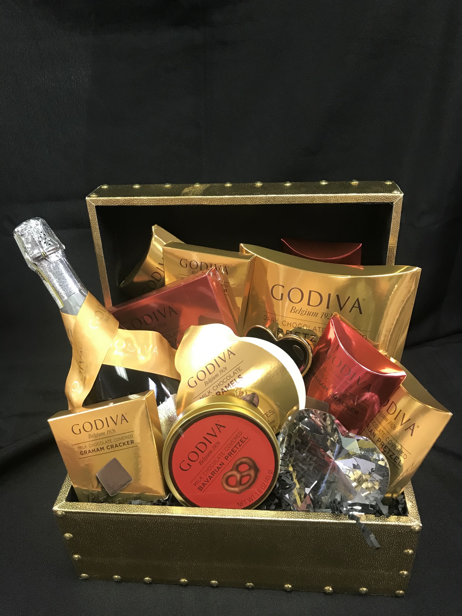 Savor the yumminess with this gold chest filled with gourmet Belgium Godiva Chocolates, a bottle of Ca'Vittoria Prosecco, and a crystal heart.
