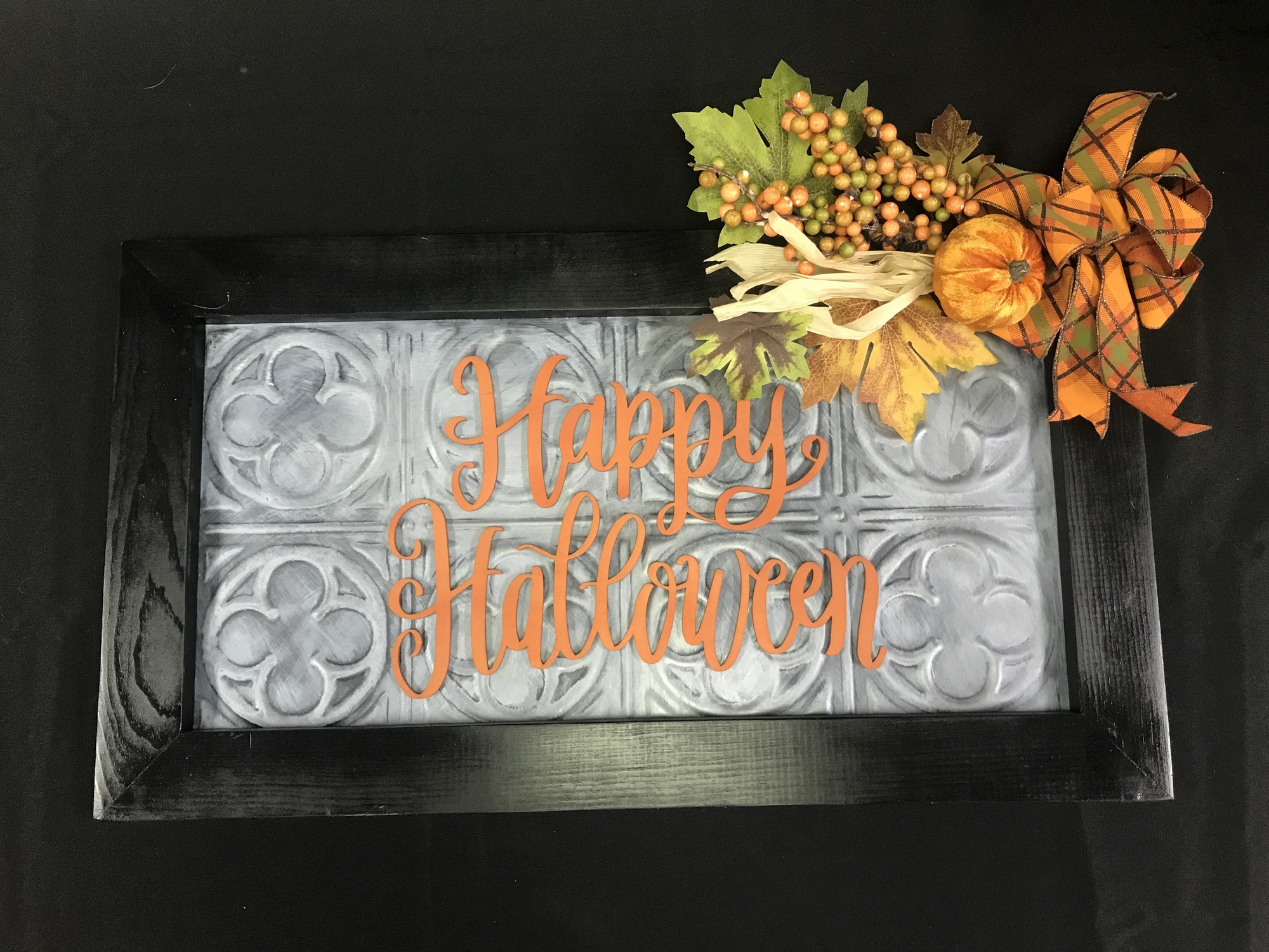 This "Happy Halloween" sign is beautifully framed and accented with a fall bow and decor.