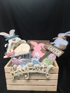 Hop into Easter with this wooden crate containing two Easter yard signs, a wall hanging, a wooden bunny, a wire basket with shimmering eggs, colorful wicker eggs, and a metal "Happy Easter" sign.