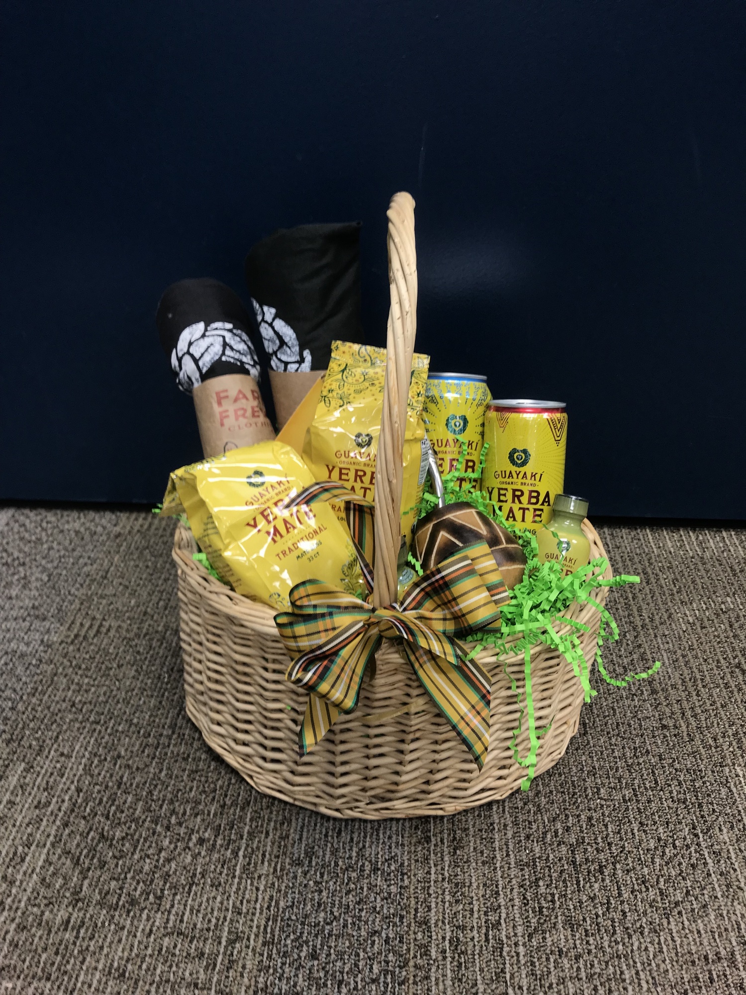 Get energized with this gift basket from Guayaki! This basket includes a variety of Yerba Mate products, made from the naturally caffeinated and nourishing leaves of the celebrated South American rainforest holly tree. It also includes a men's long-sleeve shirt (size M) and a women's long-sleeve shirt (size M).