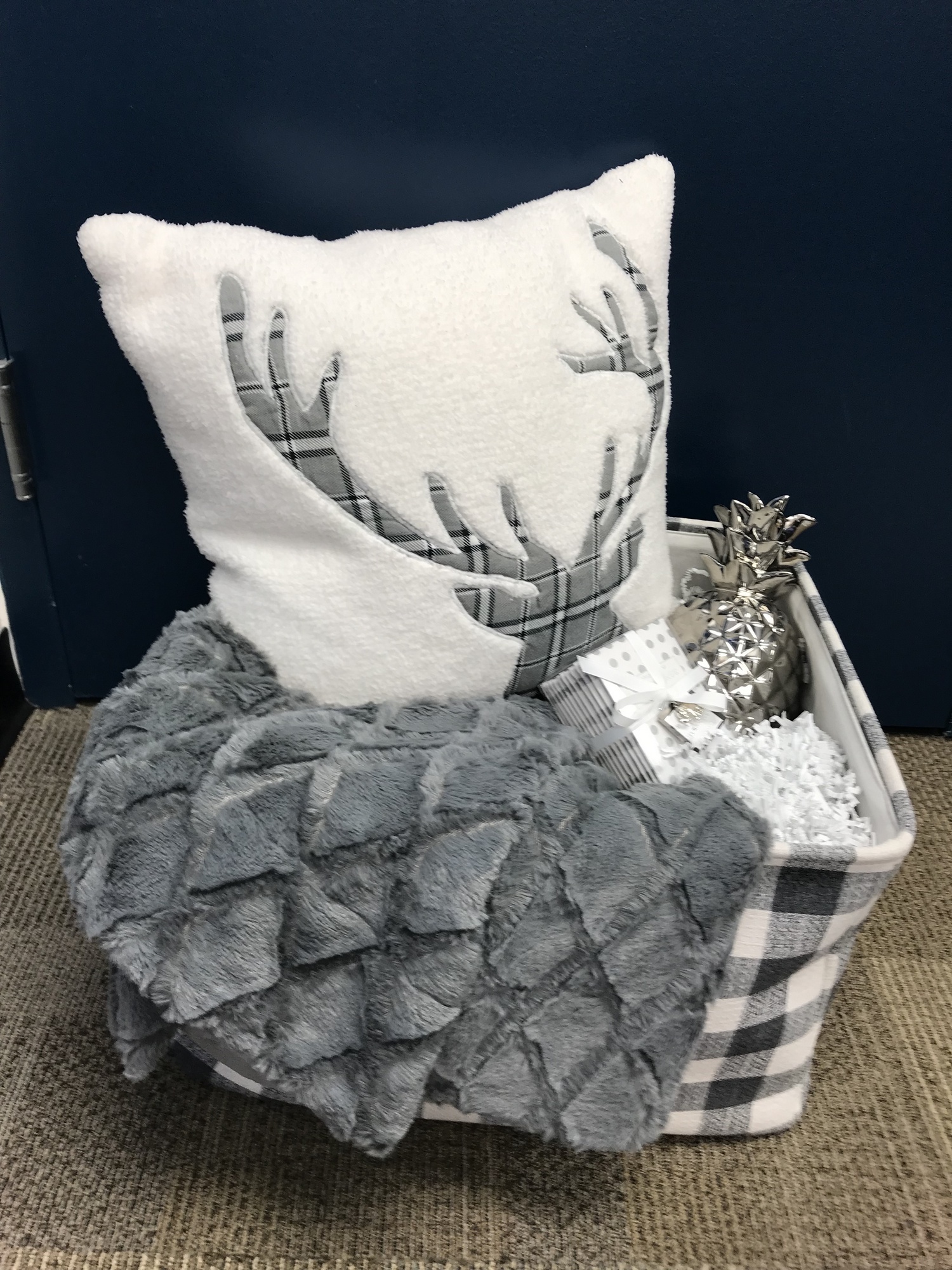 This home decor set will not only keep you warm and cozy, but it will look beautiful in your home! A faux fur deer pillow, a soft gray faux fur throw, a stylish pineapple centerpiece, and vanilla brown sugar sachets are nestled inside a cute gray and white plaid canvas storage tote.