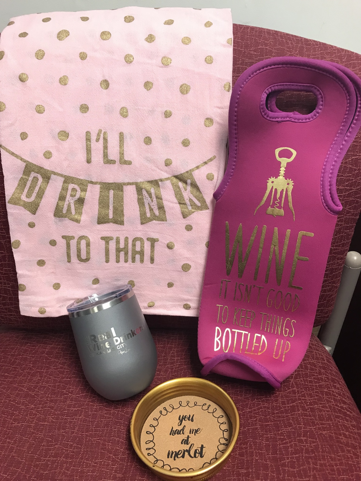 Wine enthusiasts will love this wine tote, wine coaster, "The Real Wine Drinkers of KC" insulated wine cup, and "I'll Drink to That" kitchen towel.