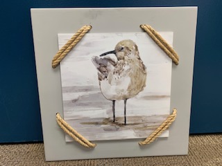 This sandpiper picture is beautifully displayed with nautical rope and a gray frame. 17" x 17"